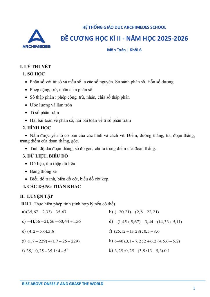 MonToan.com.vn giới thiệu đến quý thầy, cô giáo và các em học sinh đề cương ôn tập cuối học kì 2 môn Toán 6 năm học 2025 – 2026 hệ thống giáo dục Archimedes School, thành phố Hà Nội.