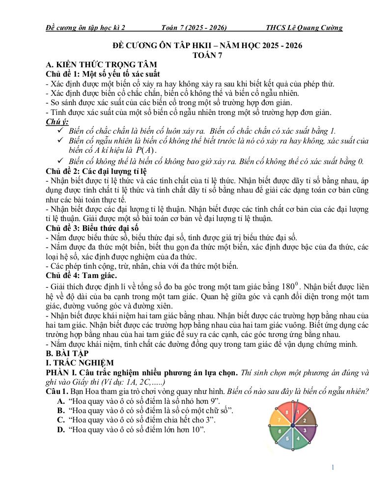 MonToan.com.vn giới thiệu đến quý thầy, cô giáo và các em học sinh đề cương ôn thi cuối học kì 2 môn Toán 7 năm học 2025 – 2026 trường THCS Lê Quang Cường, thành phố Hồ Chí Minh.