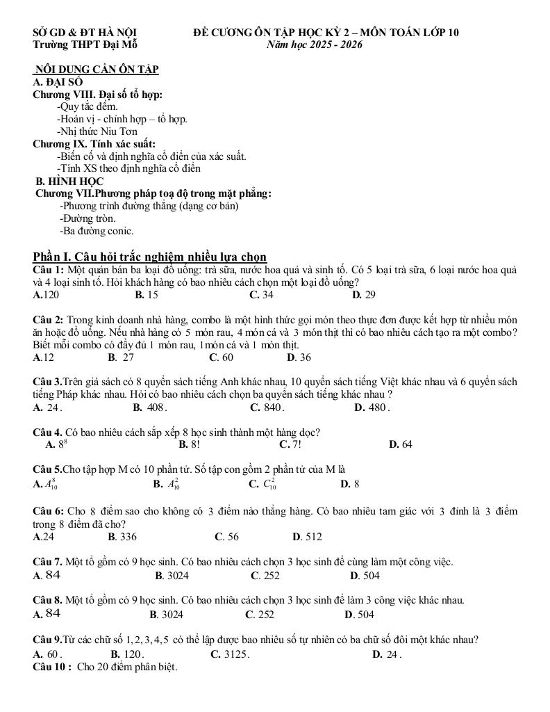 Quý thầy cô và học sinh đang tham khảo đề cương học kỳ 2 toán 10 năm 2025 – 2026 trường thpt đại mỗ – hà nội, bộ đề thi được xây dựng bám sát chuẩn đề thi toán cập nhật nhất. Cấu trúc đề bảo đảm độ phủ kiến thức đồng đều, mức độ câu hỏi được cân chỉnh từ nhận biết đến vận dụng cao, phù hợp kiểm tra toàn diện năng lực. Hãy khai thác triệt để tài liệu này để đánh giá chính xác trình độ hiện tại và tối ưu chiến lược luyện thi của bạn.