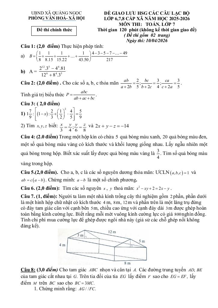 Trích dẫn Đề giao lưu HSG Toán 7 năm 2025 – 2026 xã Quảng Ngọc – Thanh Hóa: