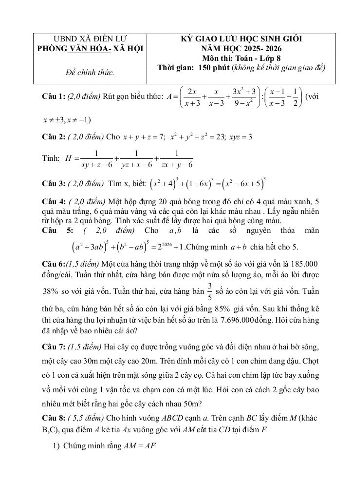 Trích dẫn Đề giao lưu HSG Toán 8 năm 2025 – 2026 xã Điền Lư – Thanh Hóa: