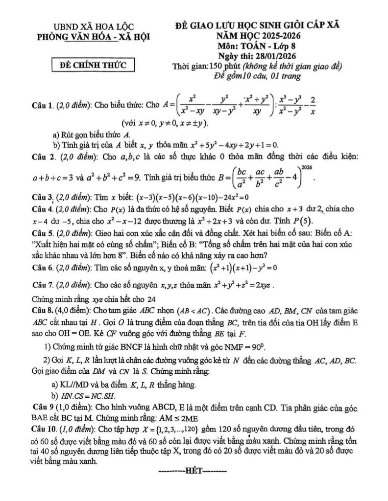 Trích dẫn Đề giao lưu HSG Toán 8 năm 2025 – 2026 xã Hoa Lộc – Thanh Hóa: