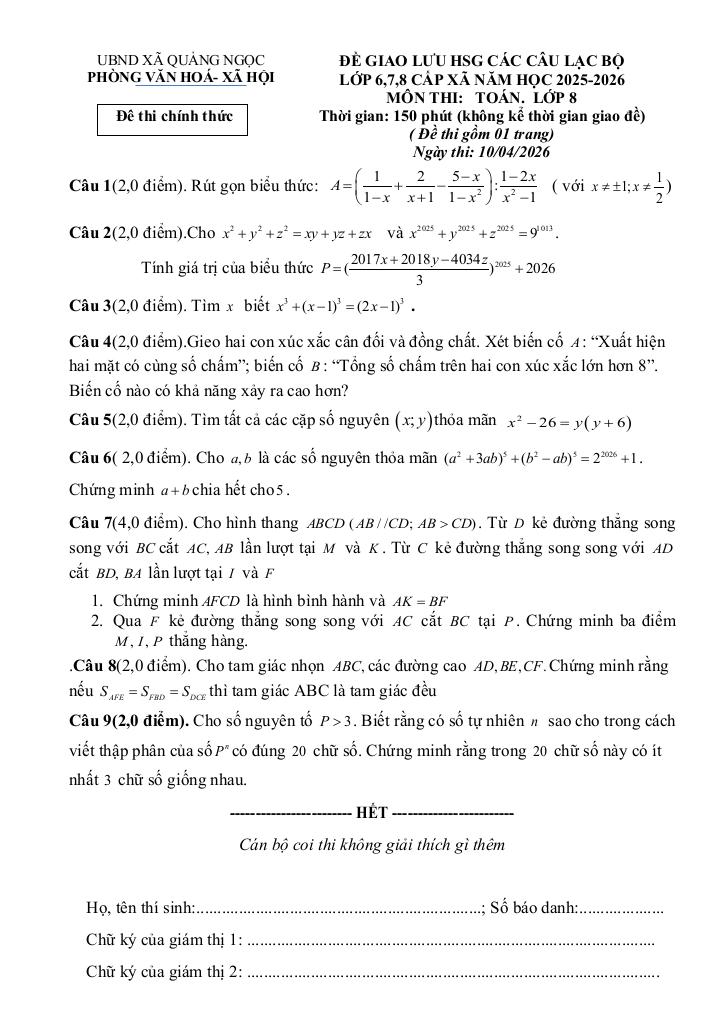 Trích dẫn Đề giao lưu HSG Toán 8 năm 2025 – 2026 xã Quảng Ngọc – Thanh Hóa: