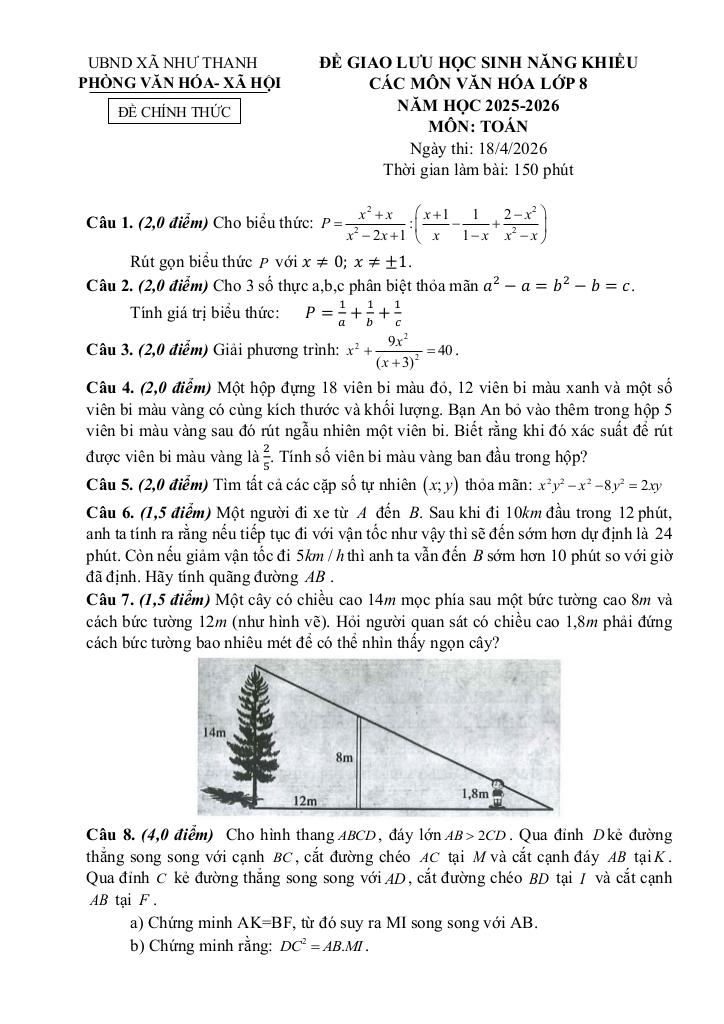 Trích dẫn Đề giao lưu HSNK Toán 8 năm 2025 – 2026 xã Như Thanh – Thanh Hóa: