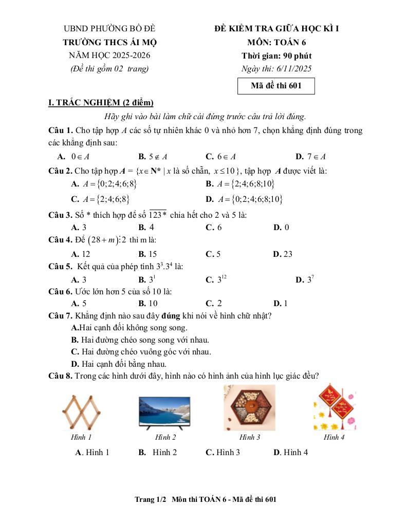 Trích dẫn Đề giữa học kì 1 Toán 6 năm 2025 – 2026 trường THCS Ái Mộ – Hà Nội: