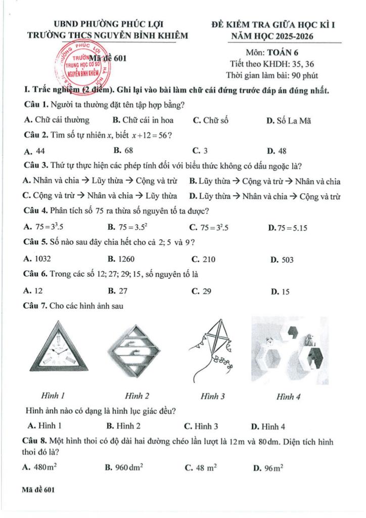 Trích dẫn Đề giữa học kì 1 Toán 6 năm 2025 – 2026 trường THCS Nguyễn Bỉnh Khiêm – Hà Nội: