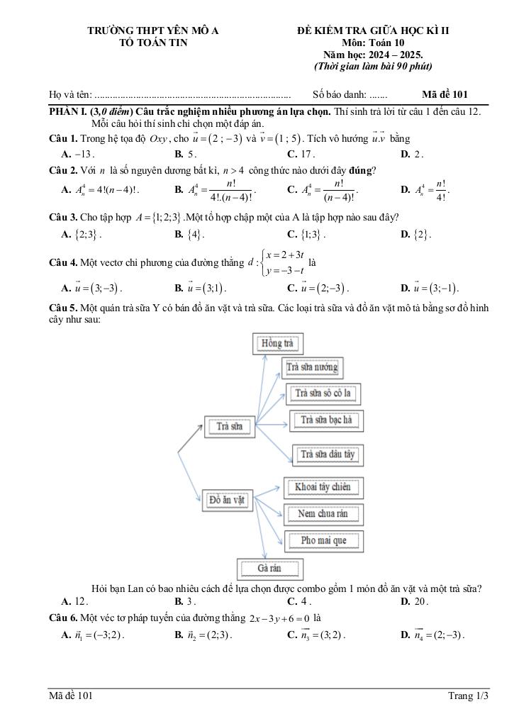 Trích dẫn Đề giữa học kì 2 Toán 10 năm 2024 – 2025 trường THPT Yên Mô A – Ninh Bình: