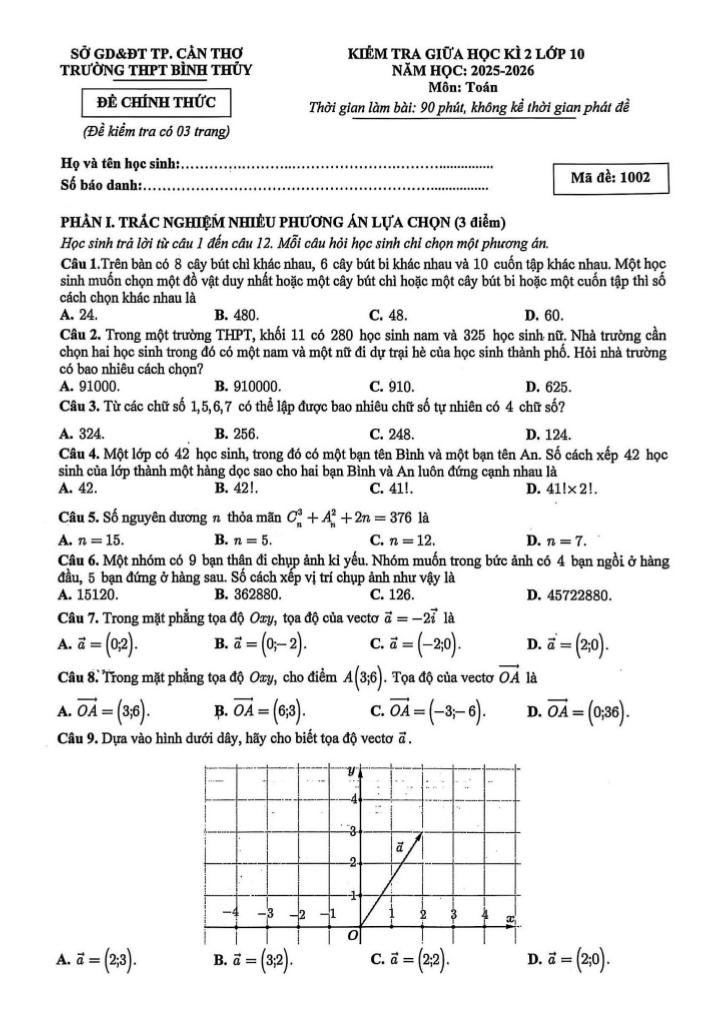 Trích dẫn Đề giữa học kì 2 Toán 10 năm 2025 – 2026 trường THPT Bình Thủy – Cần Thơ: