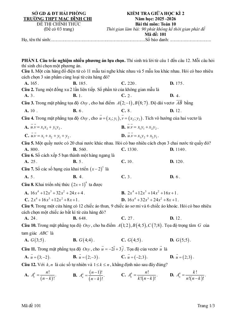 MonToan.com.vn giới thiệu đến quý thầy, cô giáo và các em học sinh đề kiểm tra giữa học kì 2 môn Toán 10 năm học 2025 – 2026 trường THPT Mạc Đĩnh Chi, thành phố Hải Phòng. Đề thi cấu trúc 03 phần: 30% trắc nghiệm nhiều phương án lựa chọn + 40% trắc nghiệm đúng sai + 30% trắc nghiệm trả lời ngắn, thời gian làm bài 90 phút, có đáp án mã đề 101 102 103 104.