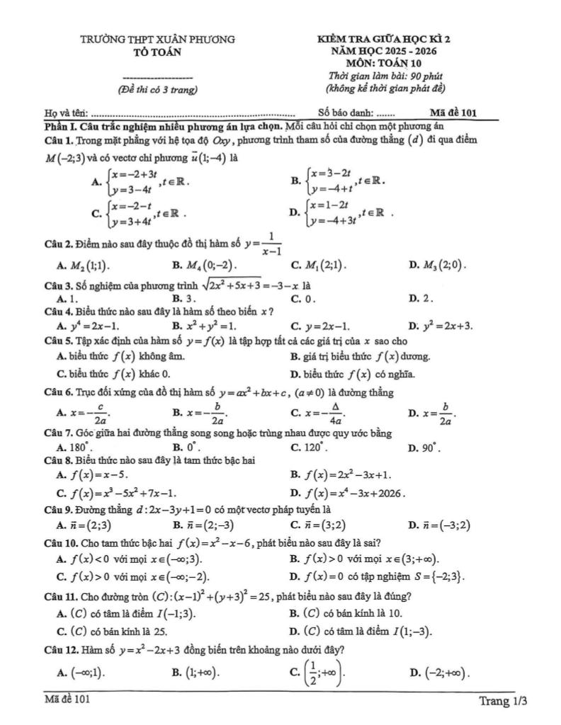 Trích dẫn Đề giữa học kì 2 Toán 10 năm 2025 – 2026 trường THPT Xuân Phương – Hà Nội: