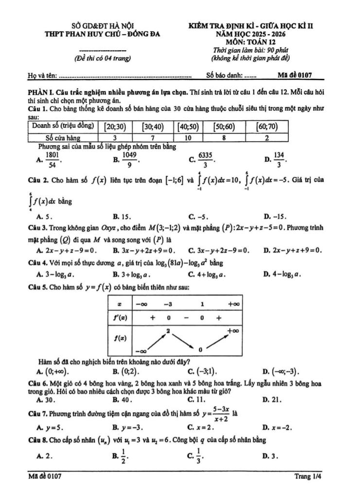 Trích dẫn Đề giữa học kì 2 Toán 12 năm 2025 – 2026 trường THPT Phan Huy Chú – Hà Nội: