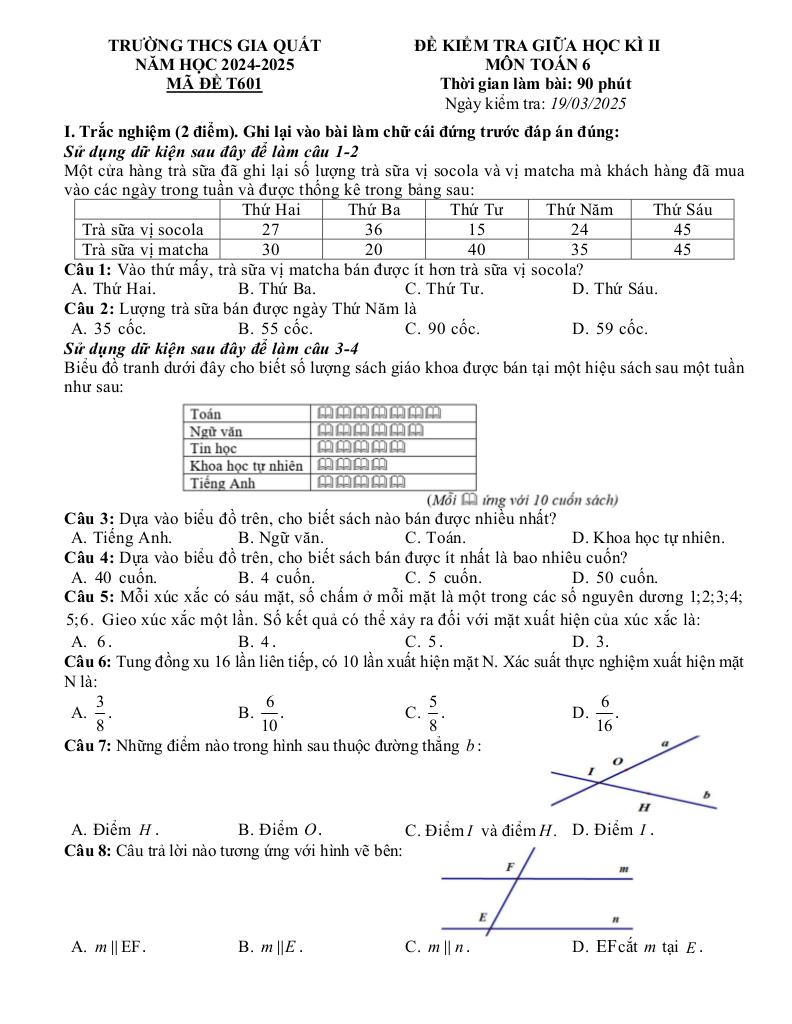 MonToan.com.vn giới thiệu đến quý thầy, cô giáo và các em học sinh đề kiểm tra giữa học kì 2 môn Toán 6 năm học 2024 – 2025 trường THCS Gia Quất, thành phố Hà Nội. Kỳ thi được diễn ra vào ngày 19 tháng 03 năm 2025.