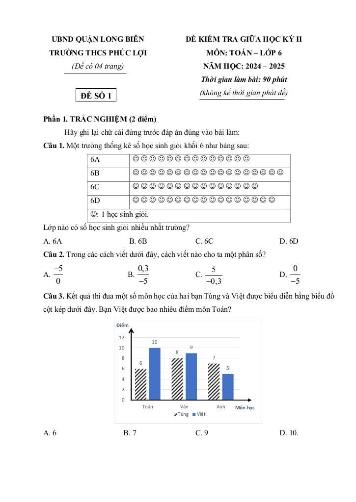 Trích dẫn Đề giữa học kì 2 Toán 6 năm 2024 – 2025 trường THCS Phúc Lợi – Hà Nội: