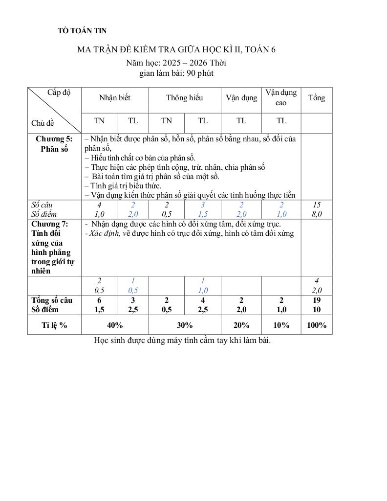 MonToan.com.vn giới thiệu đến quý thầy, cô giáo và các em học sinh đề kiểm tra giữa học kì 2 môn Toán 6 năm học 2025 – 2026 trường THCS Phước Bửu, thành phố Hồ Chí Minh. Đề thi có đáp án và hướng dẫn chấm điểm.