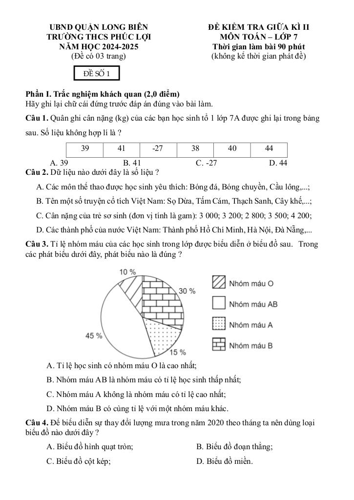 Trích dẫn Đề giữa học kì 2 Toán 7 năm 2024 – 2025 trường THCS Phúc Lợi – Hà Nội: