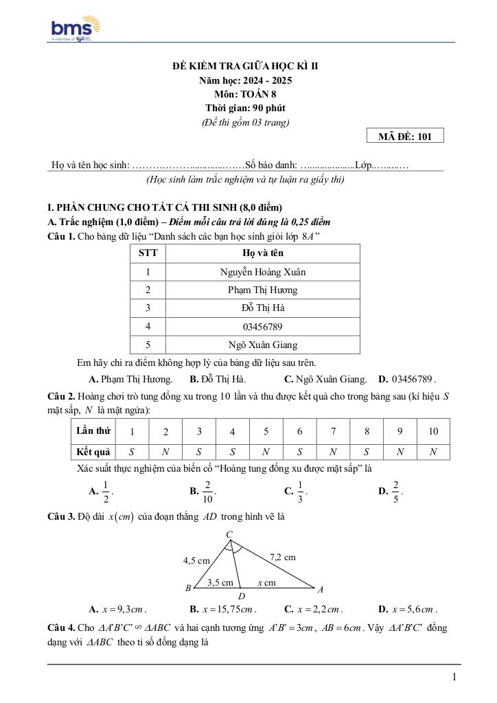 Trích dẫn Đề giữa học kì 2 Toán 8 năm 2024 – 2025 trường Ban Mai School – Hà Nội: