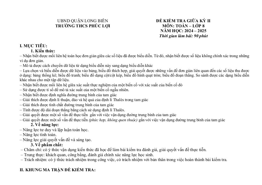 Trích dẫn Đề giữa học kì 2 Toán 8 năm 2024 – 2025 trường THCS Phúc Lợi – Hà Nội: