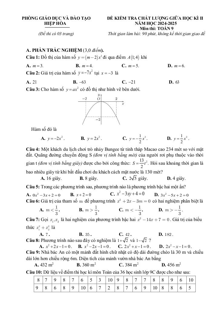Trích dẫn Đề giữa học kì 2 Toán 9 năm 2024 – 2025 phòng GD&ĐT Hiệp Hòa – Bắc Giang: