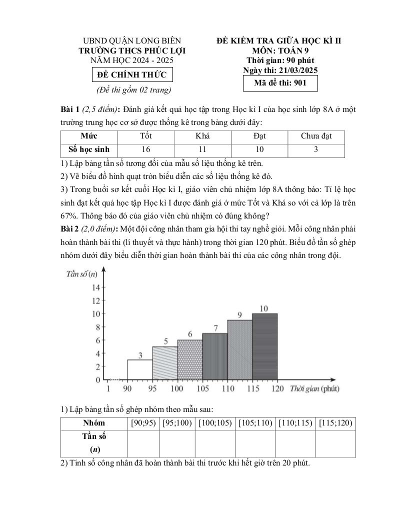 Trích dẫn Đề giữa học kì 2 Toán 9 năm 2024 – 2025 trường THCS Phúc Lợi – Hà Nội: