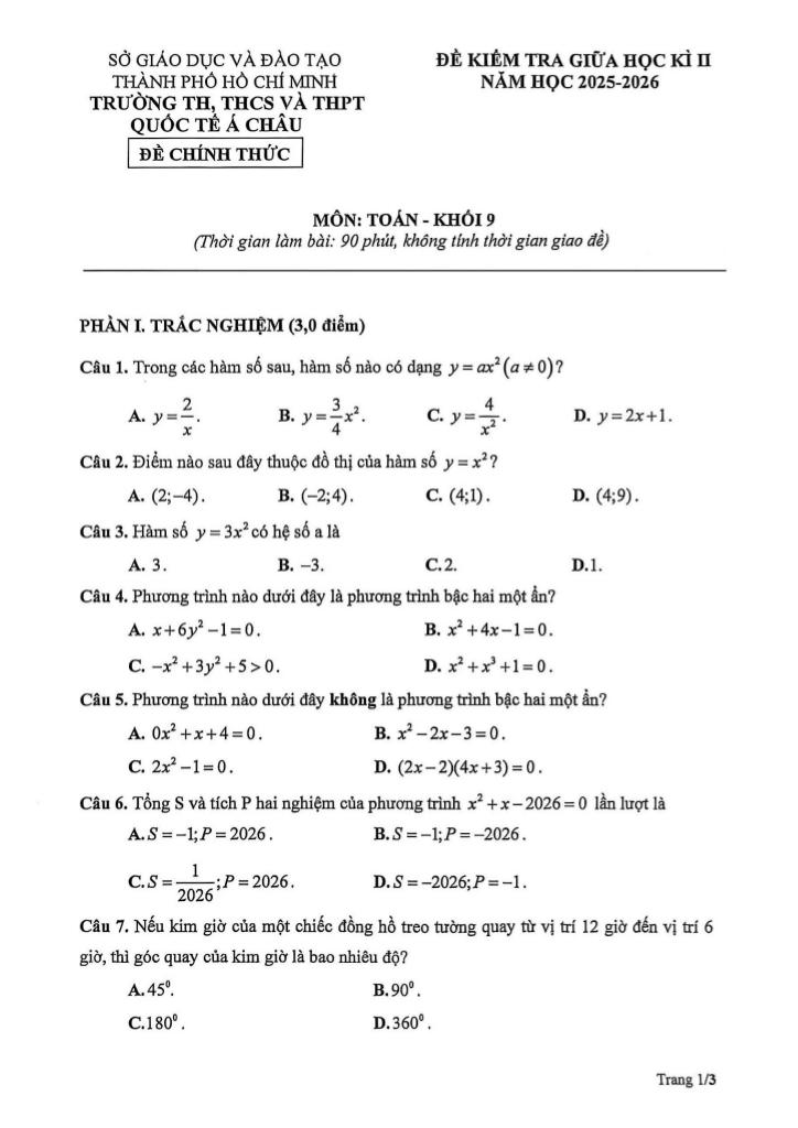 Trích dẫn Đề giữa học kì 2 Toán 9 năm 2025 – 2026 trường Quốc tế Á Châu – TP HCM: