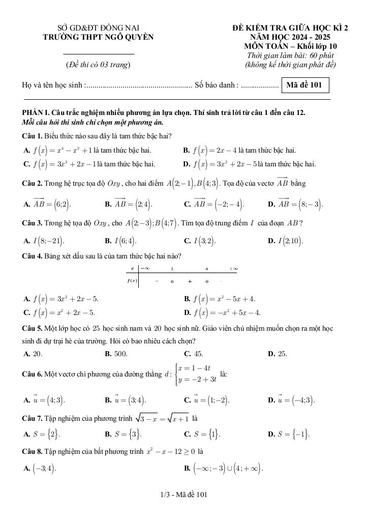 Quý thầy cô và học sinh đang tham khảo đề giữa học kỳ 2 toán 10 năm 2024 – 2025 trường thpt ngô quyền – đồng nai, bộ đề thi được xây dựng bám sát chuẩn học toán cập nhật nhất. Cấu trúc đề bảo đảm độ phủ kiến thức đồng đều, mức độ câu hỏi được cân chỉnh từ nhận biết đến vận dụng cao, phù hợp kiểm tra toàn diện năng lực. Hãy khai thác triệt để tài liệu này để đánh giá chính xác trình độ hiện tại và tối ưu chiến lược luyện thi của bạn.