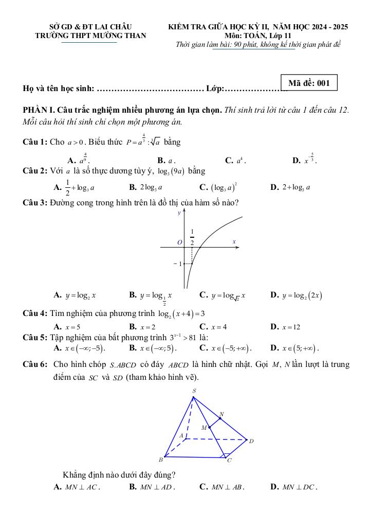 MonToan.com.vn giới thiệu đến quý thầy, cô giáo và các em học sinh đề kiểm tra giữa học kỳ 2 môn Toán 11 năm học 2024 – 2025 trường THPT Mường Than, tỉnh Lai Châu. Đề thi có đáp án và hướng dẫn chấm điểm.