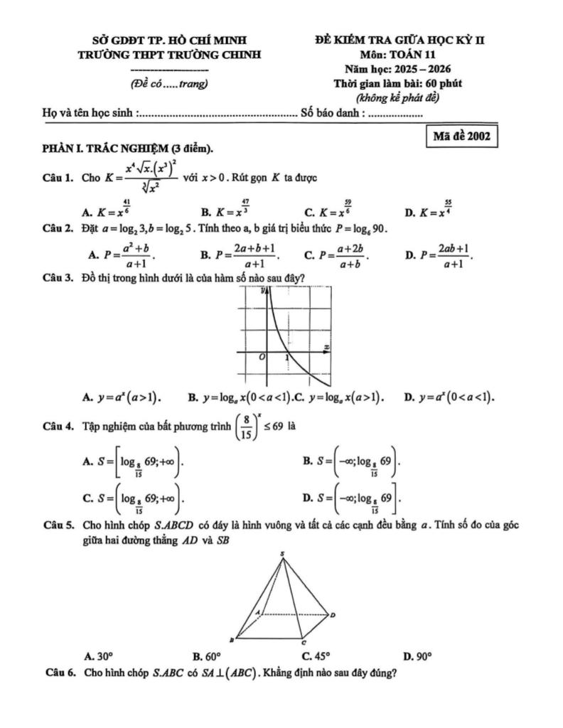 Trích dẫn Đề giữa học kỳ 2 Toán 11 năm 2025 – 2026 trường THPT Trường Chinh – TP HCM: