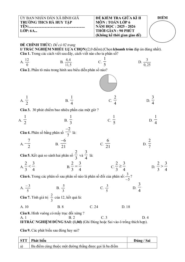 Trích dẫn Đề giữa học kỳ 2 Toán 6 năm 2025 – 2026 trường THCS Hà Huy Tập – TP HCM: