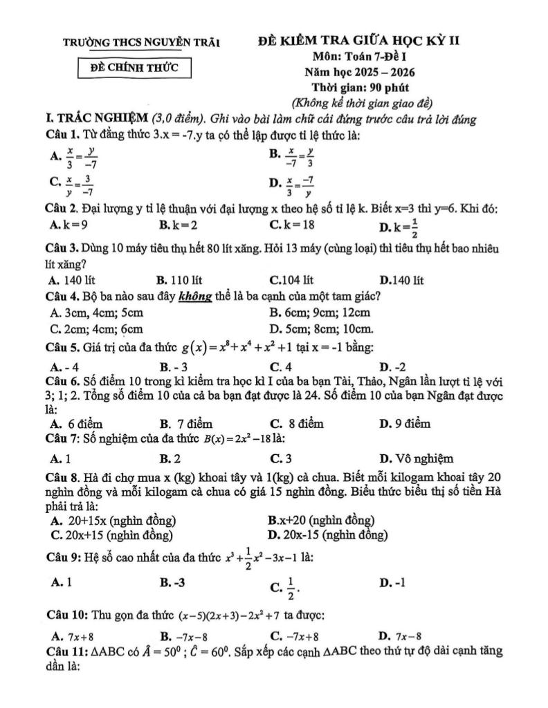 Trích dẫn Đề giữa học kỳ 2 Toán 7 năm 2025 – 2026 trường THCS Nguyễn Trãi – Hà Nội: