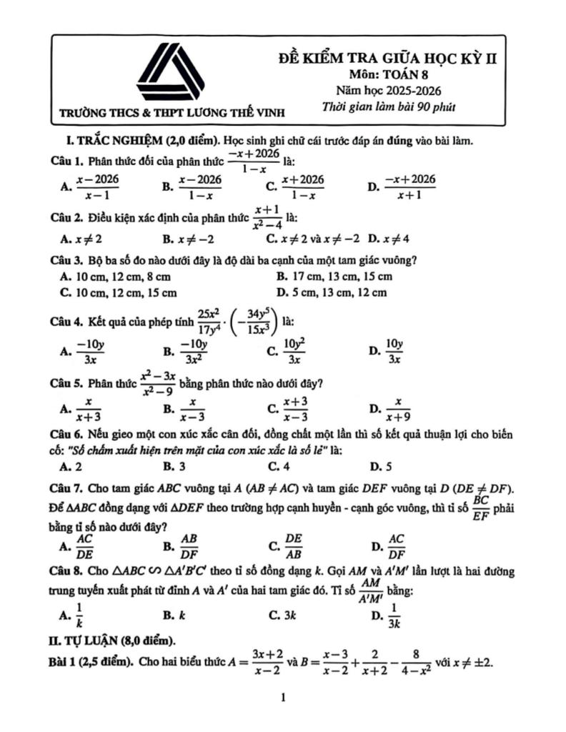 Trích dẫn Đề giữa học kỳ 2 Toán 8 năm 2025 – 2026 trường Lương Thế Vinh – Hà Nội: