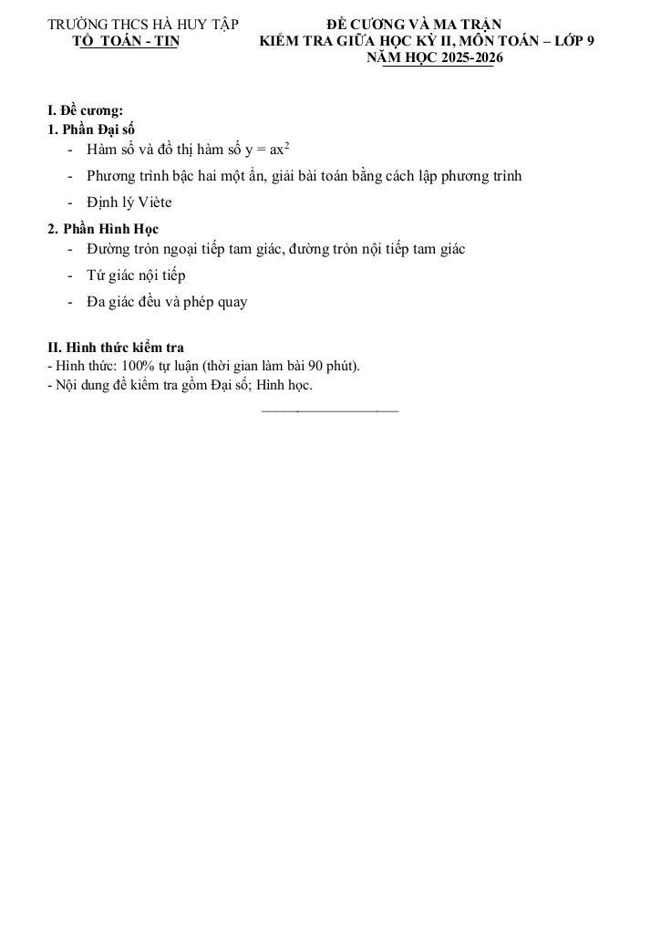 MonToan.com.vn giới thiệu đến quý thầy, cô giáo và các em học sinh đề kiểm tra giữa học kỳ 2 môn Toán 9 năm học 2025 – 2026 trường THCS Hà Huy Tập, thành phố Hồ Chí Minh. Đề thi có đáp án, lời giải chi tiết và hướng dẫn chấm điểm.