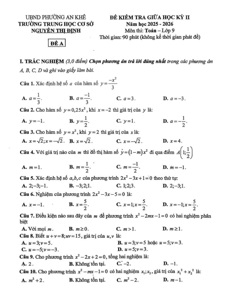 Trích dẫn Đề giữa học kỳ 2 Toán 9 năm 2025 – 2026 trường THCS Nguyễn Thị Định – Đà Nẵng: