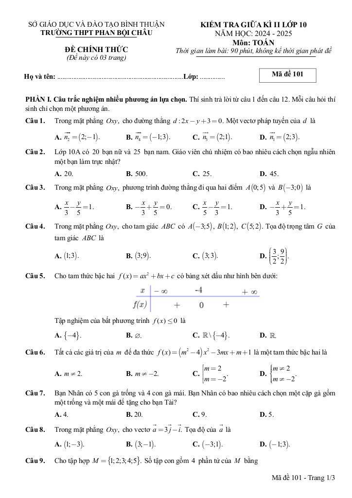 Trích dẫn Đề giữa kì 2 Toán 10 năm 2024 – 2025 trường THPT Phan Bội Châu – Bình Thuận: