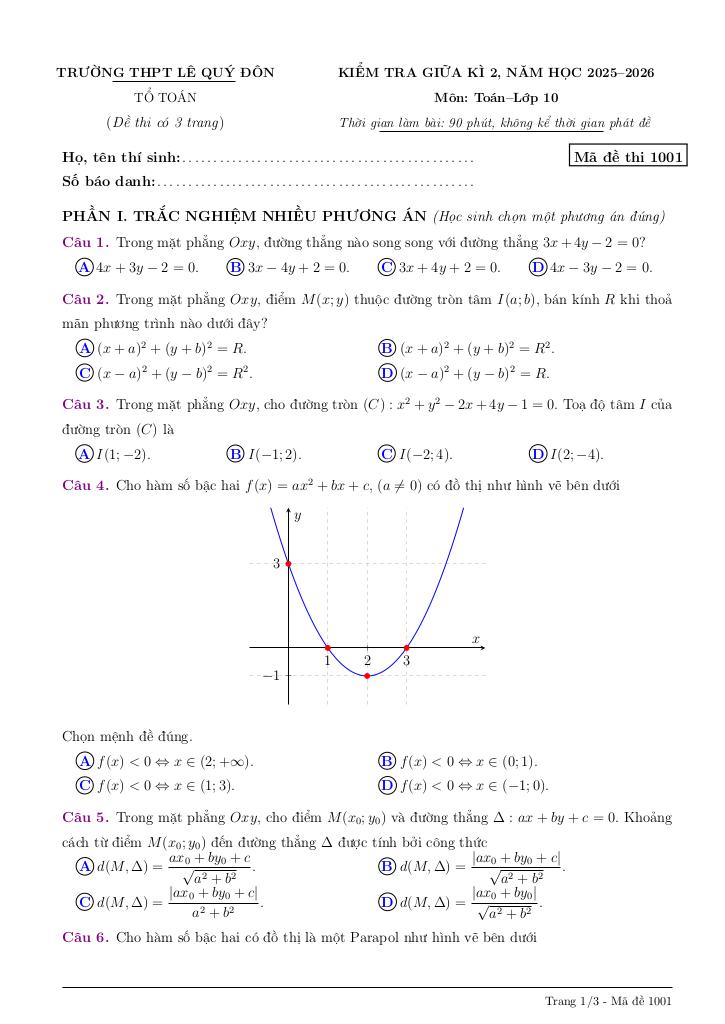 Trích dẫn Đề giữa kì 2 Toán 10 năm 2025 – 2026 trường THPT Lê Quý Đôn – Quảng Ngãi: