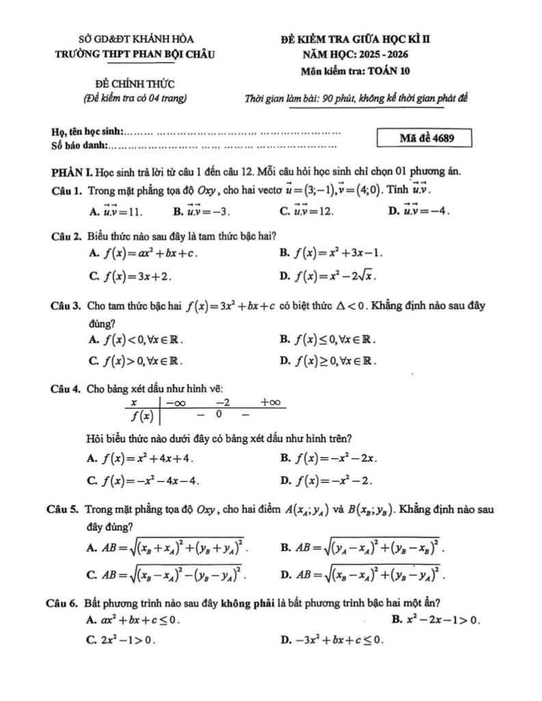 Trích dẫn Đề giữa kì 2 Toán 10 năm 2025 – 2026 trường THPT Phan Bội Châu – Khánh Hòa: