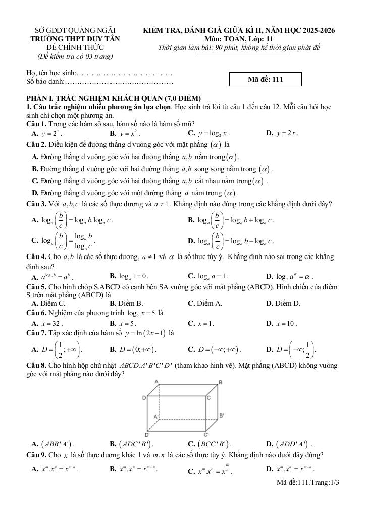 Trích dẫn Đề giữa kì 2 Toán 11 năm 2025 – 2026 trường THPT Duy Tân – Quảng Ngãi: