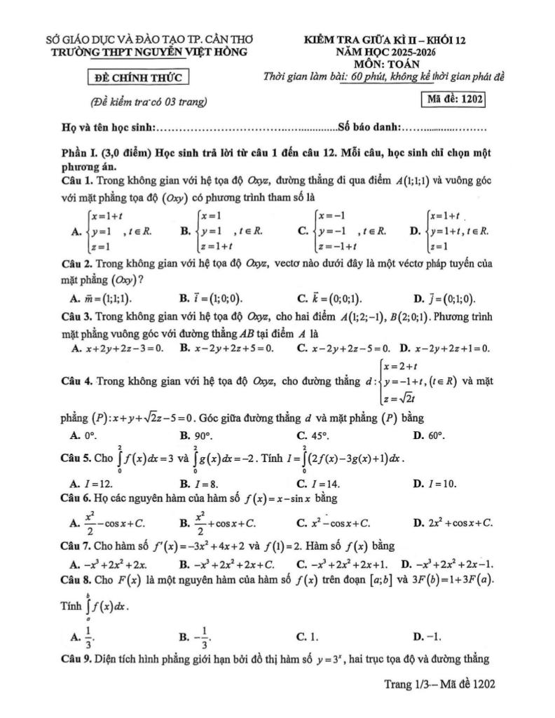 Trích dẫn Đề giữa kì 2 Toán 12 năm 2025 – 2026 trường THPT Nguyễn Việt Hồng – Cần Thơ:
