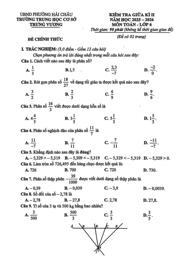Trích dẫn Đề giữa kì 2 Toán 6 năm 2025 – 2026 trường THCS Trưng Vương – Đà Nẵng: