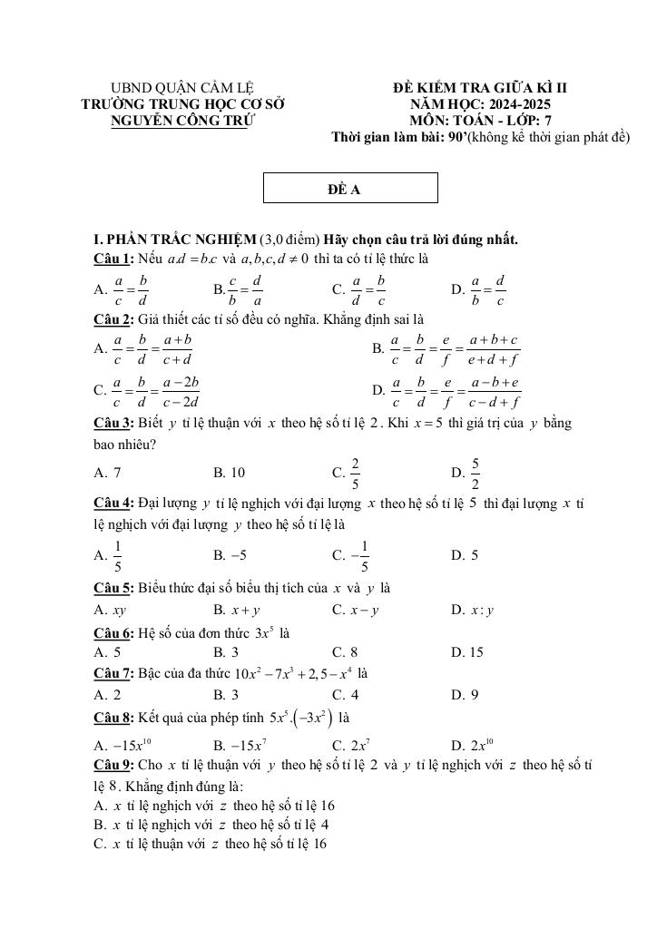 Trích dẫn Đề giữa kì 2 Toán 7 năm 2024 – 2025 trường THCS Nguyễn Công Trứ – Đà Nẵng:
