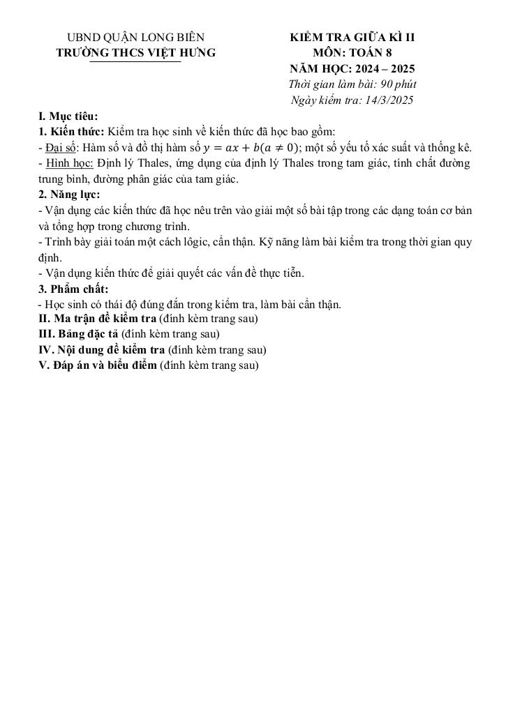 MonToan.com.vn giới thiệu đến quý thầy, cô giáo và các em học sinh đề kiểm tra giữa học kì 2 môn Toán 8 năm học 2024 – 2025 trường THCS Việt Hưng, quận Long Biên, thành phố Hà Nội. Đề thi có đáp án và hướng dẫn chấm điểm.