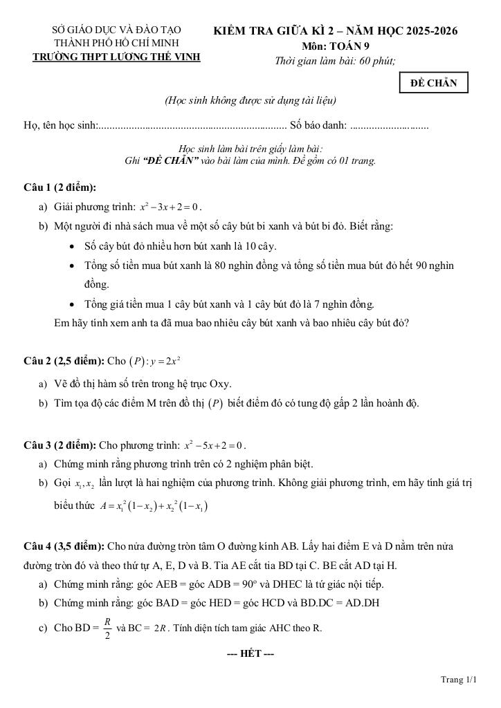 Trích dẫn Đề giữa kì 2 Toán 9 năm 2025 – 2026 trường THPT Lương Thế Vinh – TP HCM: