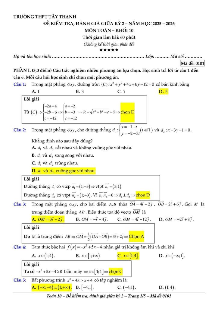 Trích dẫn Đề giữa kỳ 2 Toán 10 năm 2025 – 2026 trường THPT Tây Thạnh – TP HCM: