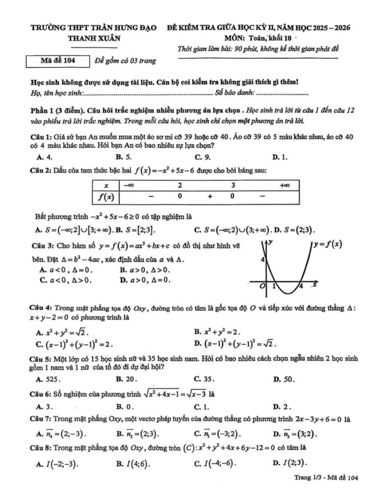 Trích dẫn Đề giữa kỳ 2 Toán 10 năm 2025 – 2026 trường THPT Trần Hưng Đạo – Hà Nội: