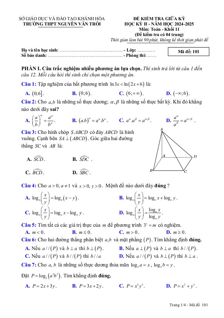 Trích dẫn Đề giữa kỳ 2 Toán 11 năm 2024 – 2025 trường THPT Nguyễn Văn Trỗi – Khánh Hòa: