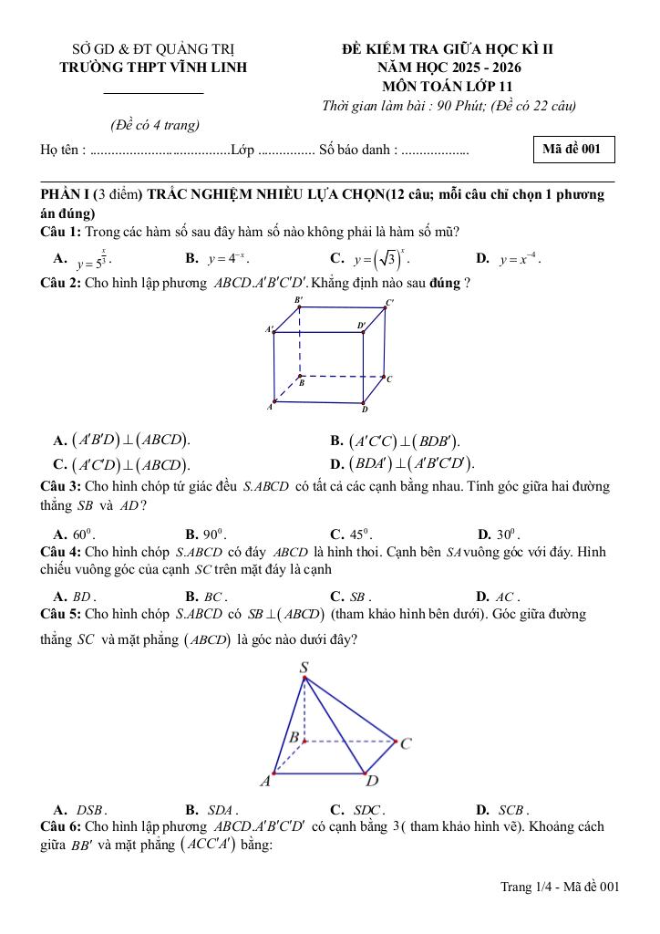 Trích dẫn Đề giữa kỳ 2 Toán 11 năm 2025 – 2026 trường THPT Vĩnh Linh – Quảng Trị: