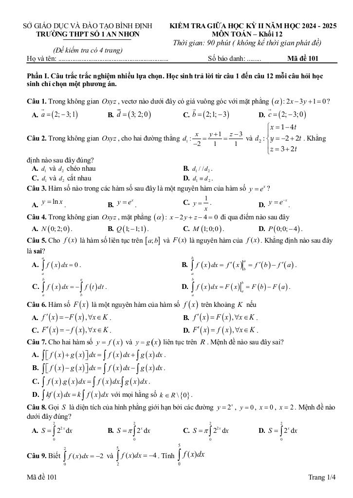 Quý thầy cô và học sinh đang tham khảo đề giữa kỳ 2 toán 12 năm 2024 – 2025 trường thpt số 1 an nhơn – bình định, bộ đề thi được xây dựng bám sát chuẩn soạn toán cập nhật nhất. Cấu trúc đề bảo đảm độ phủ kiến thức đồng đều, mức độ câu hỏi được cân chỉnh từ nhận biết đến vận dụng cao, phù hợp kiểm tra toàn diện năng lực. Hãy khai thác triệt để tài liệu này để đánh giá chính xác trình độ hiện tại và tối ưu chiến lược luyện thi của bạn.