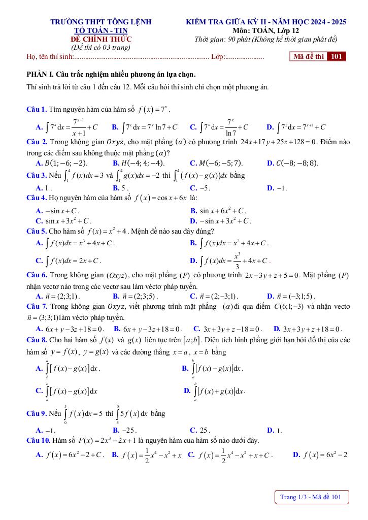Quý thầy cô và học sinh đang tham khảo đề giữa kỳ 2 toán 12 năm 2024 – 2025 trường thpt tông lệnh – sơn la, bộ đề thi được xây dựng bám sát chuẩn môn toán cập nhật nhất. Cấu trúc đề bảo đảm độ phủ kiến thức đồng đều, mức độ câu hỏi được cân chỉnh từ nhận biết đến vận dụng cao, phù hợp kiểm tra toàn diện năng lực. Hãy khai thác triệt để tài liệu này để đánh giá chính xác trình độ hiện tại và tối ưu chiến lược luyện thi của bạn.