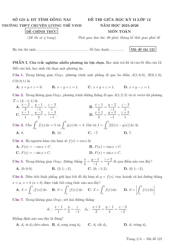 Trích dẫn Đề giữa kỳ 2 Toán 12 năm 2025 – 2026 trường chuyên Lương Thế Vinh – Đồng Nai: