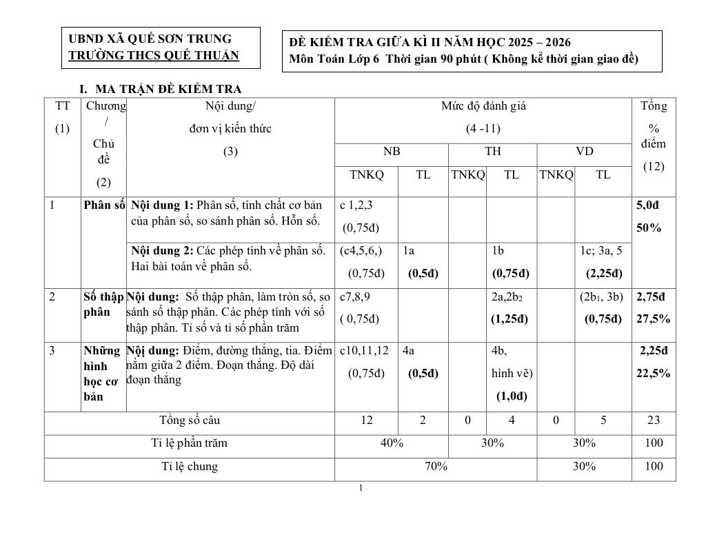 Nội dung Đề giữa kỳ 2 Toán 6 năm 2025 – 2026 trường THCS Quế Thuận – Đà Nẵng: