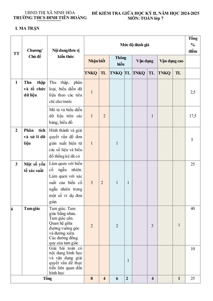 Ma trận Đề giữa kỳ 2 Toán 7 năm 2024 – 2025 trường THCS Đinh Tiên Hoàng – Khánh Hòa: